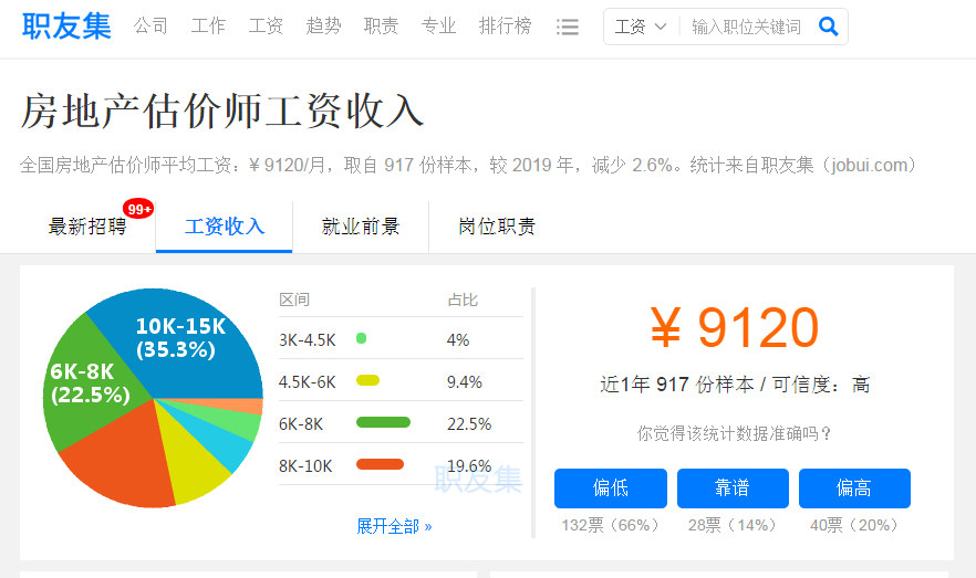 在职友网的招聘信息中,共有787条在招房地产估价师的信息。在这787条中,只有160条是月工资低于6千元。可以说是非常诱人的工资条件了。