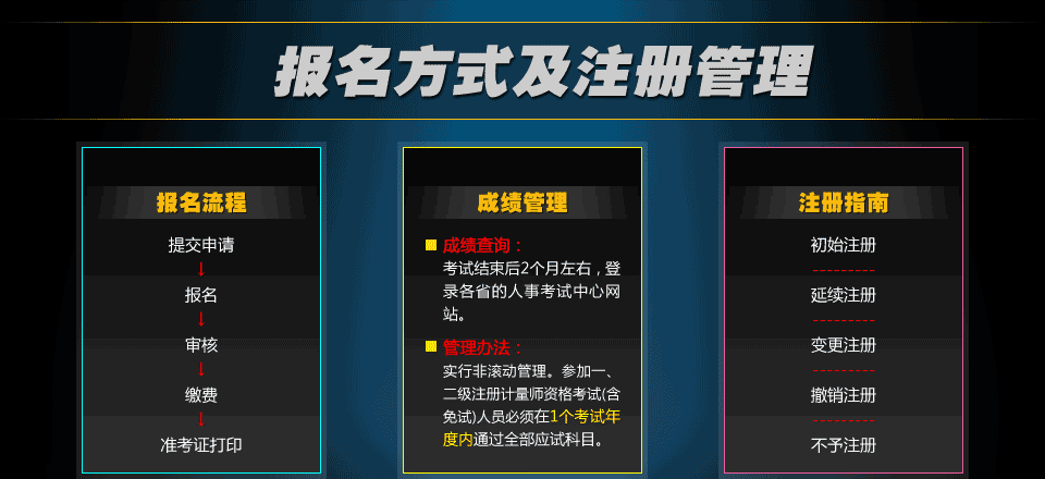 注册计量师考试成绩实行非滚动管理。参加一、二级注册计量师资格考试(含免试)人员必须在1个考试年度内通过全部应试科目,方可获得相应级别资格证书。