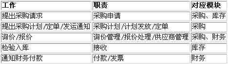 上表中可以清楚的看到,系统将部分工作从采购模块中全部或部分剥离出来,如提出采购请求、检验入库、通知财务付款、供应商管理这几个工作等。系统的这种设计方法是将所要完成的工作分解成相关的职责,并对应到模块中,在ERP实施中,最好将属于一个模块的职责进行组合成一个工作组或业务部门,这样做的益处在于: